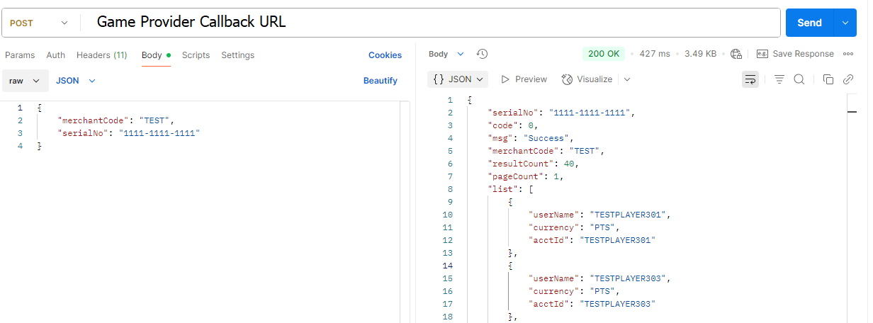 { "acctId": "TESTPLAYER1", "language": "en_US", "merchantCode": "TEST", "gameCode": "sLongX3", "forFun": "false", "token": "fe1a85adc54545d2963b661a22d09c9e", "serialNo": "20120722224255982841" }